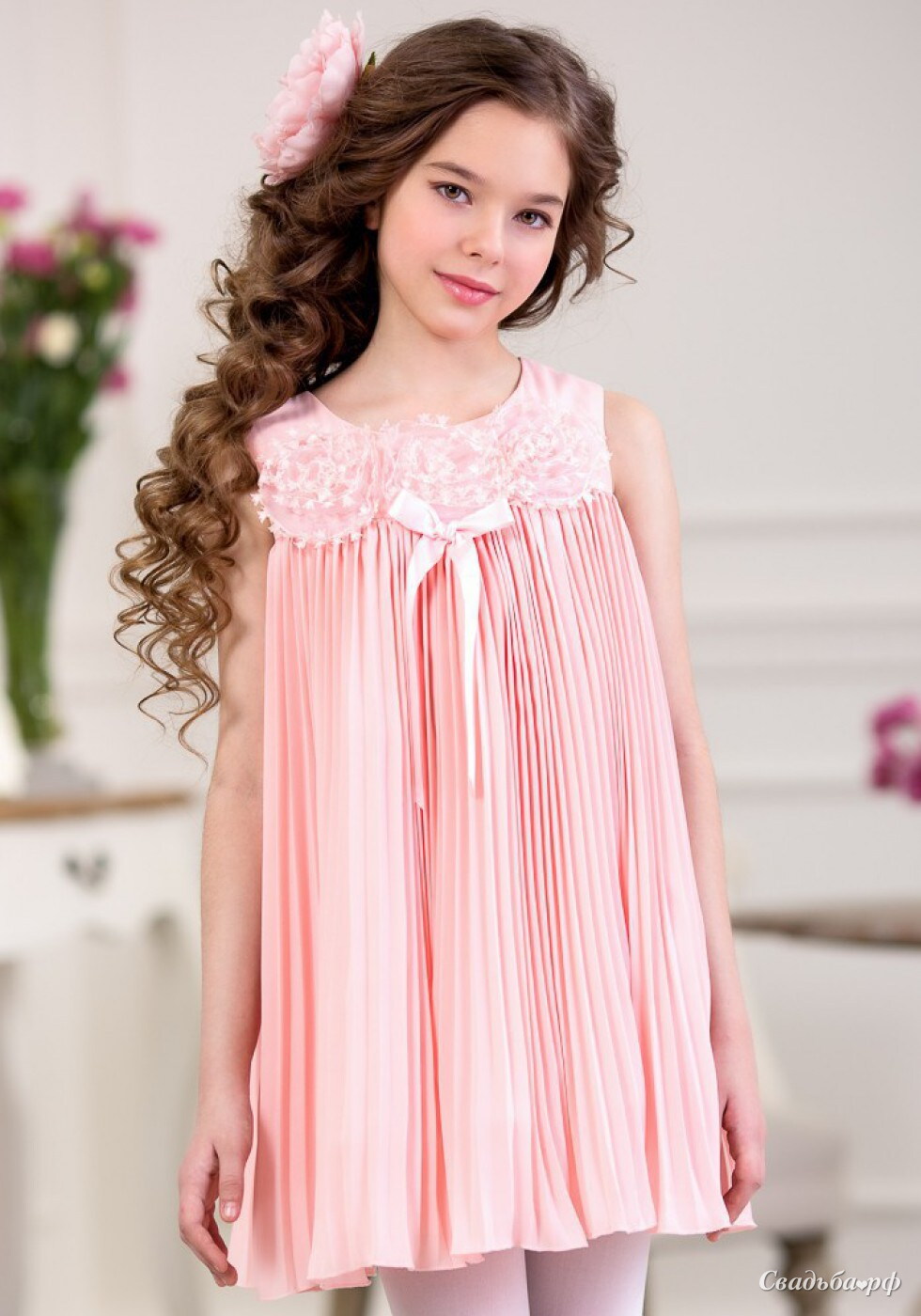 Нарядное детское воздушное платье из шифоновой ткани для девочки будет актуально для любого праздничного мероприятия, будь то день рождения, выпускной в детском саду или начальной школе. Воздушное платье из шифоновой плиссированной ткани нежных цветов чайной розы и мяты, можно купить в нашем интернет-магазине. Кокетка платья украшена воздушными объемными цветочками и бантиком из атласной ленты. На спинке потайная застежка молния.