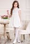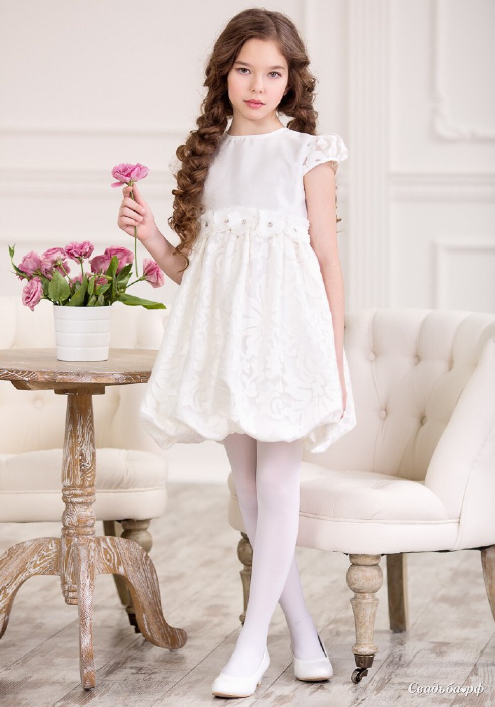 Нарядное платье нежных цветов с короткими рукавчиками-французский фонарик. Кокетка платья из однотонной ткани, по линии кокетки впереди украшение в виде декоративных цветов, в центре которых стразики, сзади пояс, завязывающийся в бант. Рукавчики и юбка платья выполнены из полупрозрачной ткани с полупрозрачным ажурным фактурным рисунком. Подол платья выполнен в форме "баллон". Подкладка платья из хлопковой ткани.