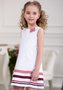 Детское платье силуэта "трапеция" белого цвета с отделкой из красной и темно-синей тесьмы выполнено в форме трапеции из хлопковой ткани, сзади платье застегивается на молнию, горловину украшает бантик в полосочку. Лаконичный стиль подчеркивает хрупкую детскую фигуру.