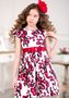 Детское платье с цветочным принтом можно купить в нашем интернет-магазине для малышек ростом от 104 до 134 см. Короткое платье со слегка завышенной линией талии, присборенной в складки юбкой выполнено из плотной ткани цвета айвори с контрастными ветками из бордовых роз. Рукава короткие в форме французских фонариков.