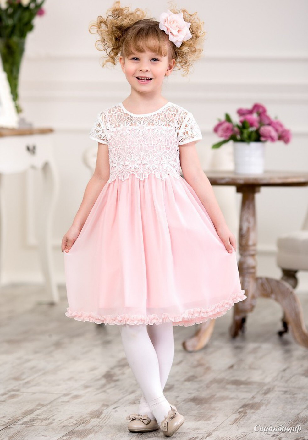 Стильное детское платье можно купить в нашем интернет -магазине с доставкой для девочек ростом от 104 до 146 см. Для данного детского платья используется контрастная комбинация двух цветов и двух тканей, на хлопковой подкладке, сзади застежка-молния. По краю подола пришита игривая оборка. По линии талии заложены мягкие складки, она завышена. Верхняя часть платья выполнена из плотного ажурного хлопкового кружева цвета айвори, юбка платья выполнена из шифона.