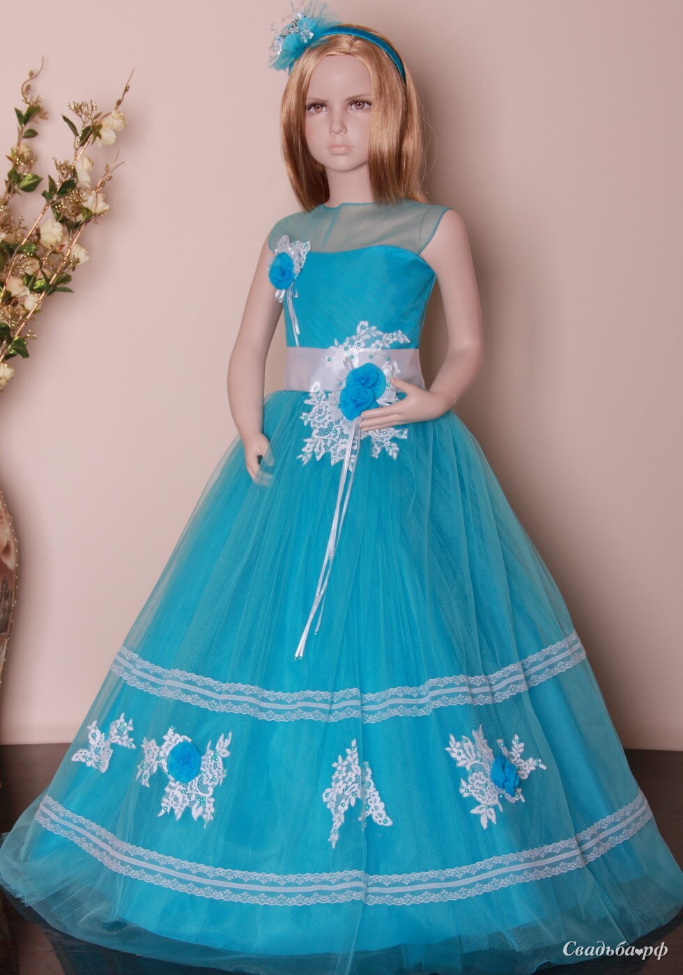 Пышное детское платье. Изюминку данной модели добавляют белые кружевные вкрапления на ярко-голубом фатине в виде цветов и оборок по юбке и корсету, а также тонкая сеточка на декольте и