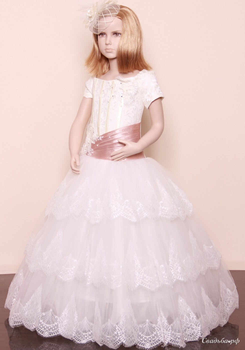 Пышное платье с корсетом. Юбка украшена тремя ярусами из фатина по краю оформленного тоненьким кружевом. Корсету придал оригинальность тёмно-розовый пояс из атласа, нестандартной формы.