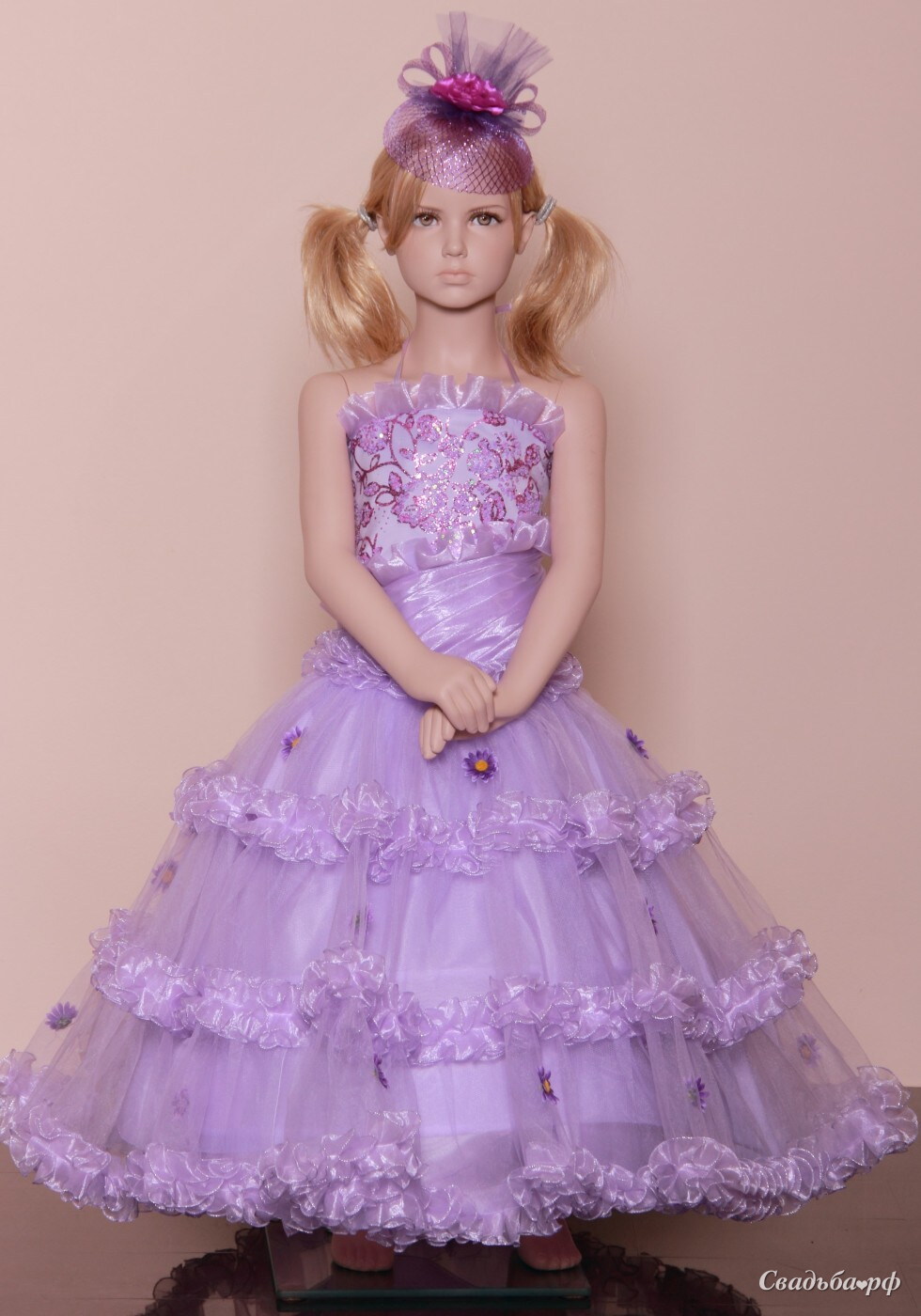Пышное детское платье с фантазийным корсетом. Верхняя часть корсета растительным узором расшита пайетками. В области талии по корсету заложены диагональные драпировки из органзы. По верхнему краю корсета и над драпировкой расположены оборки. Юбка многослойная, фатиновая, украшенная горизонтальными оборками и цветами между ними.