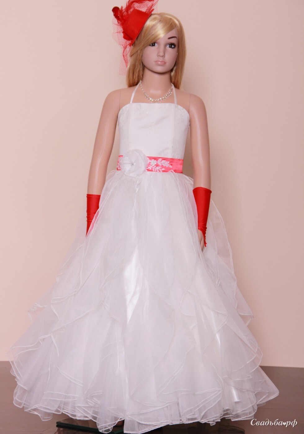А-силуэтное корсетное детское платье с завязками за шею. Верх корсета прямой, а по талии расположен атласный пояс с цветочной композицией. Юбка оформлена вертикальными фалдовыми воланами, сделанные из органзы.