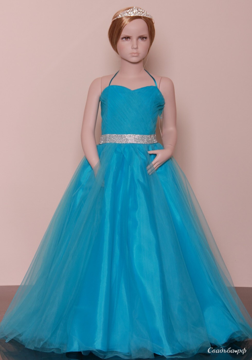 Детское корсетное А-силуэтное платье на завязках за шею. Верх корсета V-образный. По всему корсету заложены мелкие фатиновые драпировки. По талии расположен широкий стразовый пояс. Юбка выполнена из тафты, верхние слои юбки из европейского мягкого фатина.