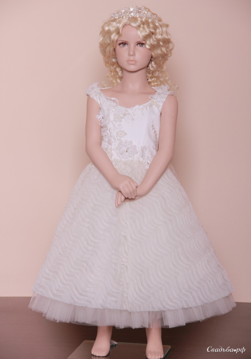 Пышное детское корсетное платье на плечиках. Корсет вышит серебристыми нитками растительным орнаментом, по которому расположены фатиновые цветы со стразами и бисером. Юбка многослойная фатиновая, верхний слой, которой короче основной длины юбки.