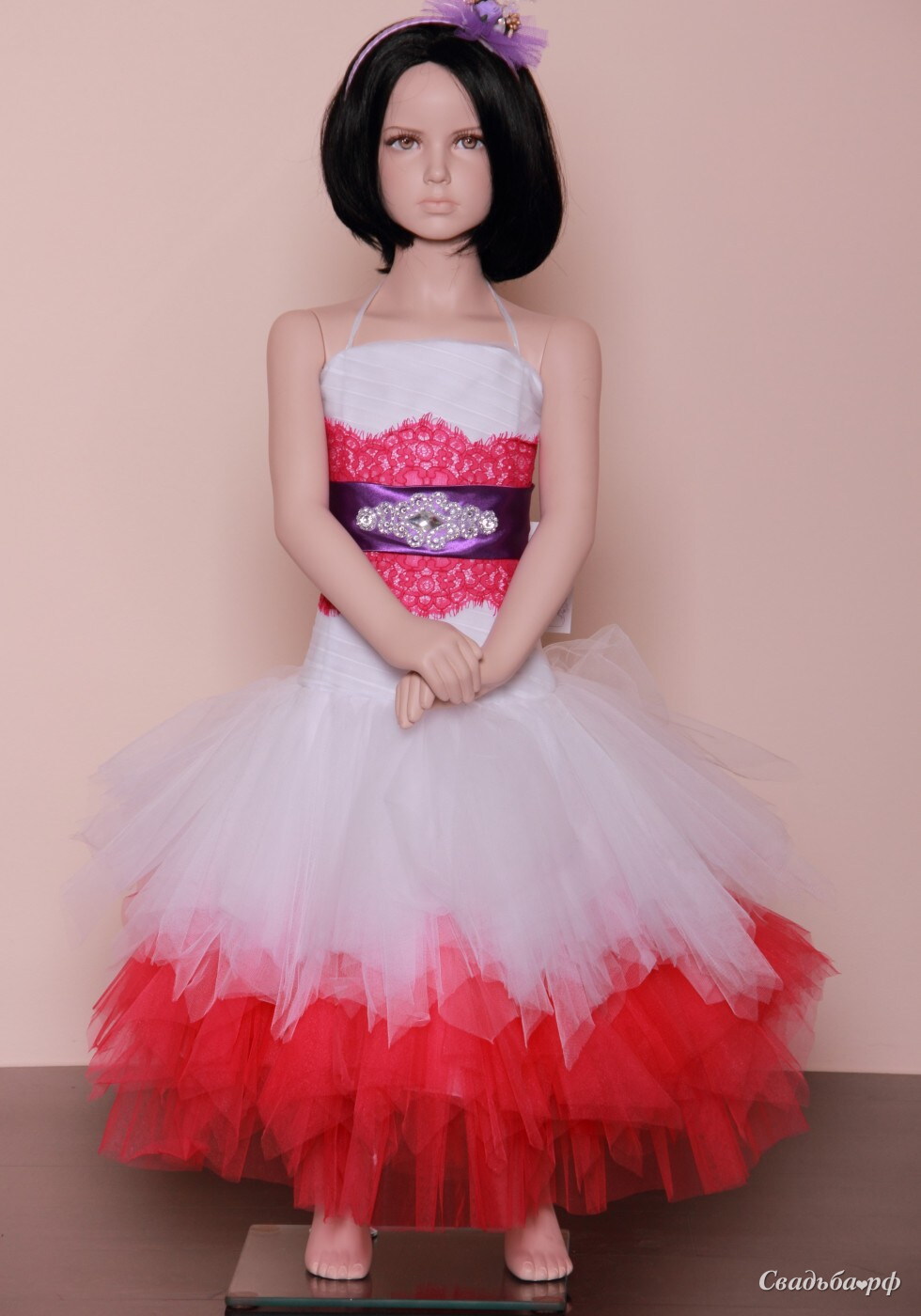 Пышное детское платье с завязками на шею и удлинённым корсетом до бёдер. На корсете выполнены горизонтальные драпировки из фатина, а на талии в красном кружеве оформлен фиолетовый пояс с расшитой брошью. Юбка ярусная, фатиновая, двухцветная.