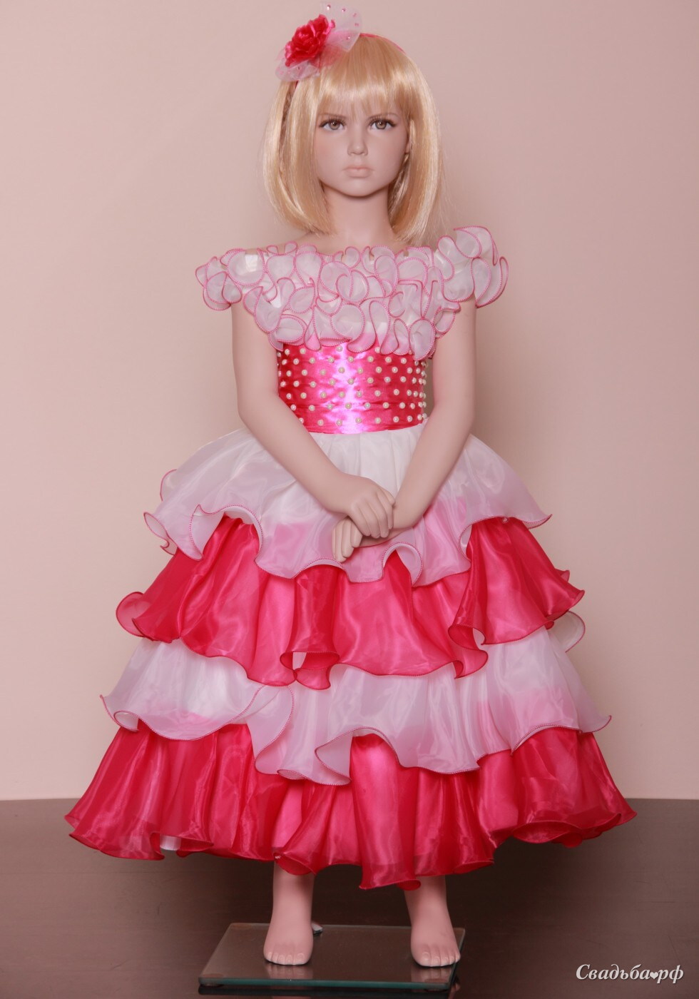 Пышное детское платье двухцветное на приспущенных плечиках. Верх лифа и плечики оформлены густой органзовой оборкой. Нижняя часть лифа атласная, украшена белыми бусинами. Юбка контрастная, ярусная, выполнена из органзы.