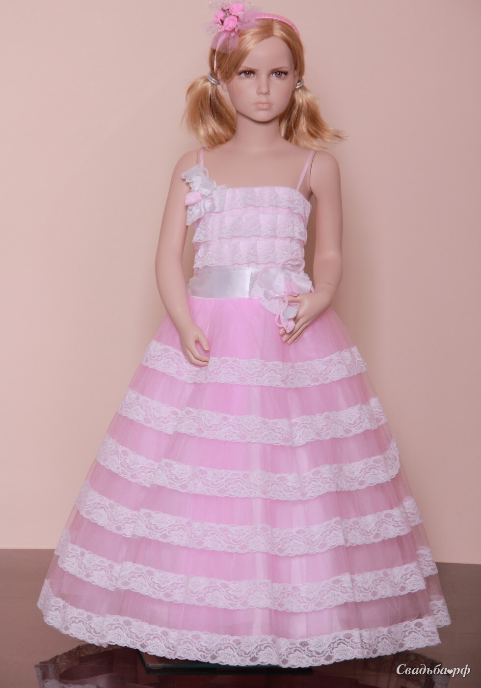 Пышное детское платье на лямках. По лифу расположены горизонтальные кружевные оборки. Спинка лифа присборена на резинку. По талии проходит атласный пояс, завязывающийся сзади на бант. Также по верху лифа и по поясу асимметрично расположены композиции из кружевных бантиков и цветов. Юбка фатиновая, украшена горизонтально в несколько рядов кружевной контрастной тесьмой.