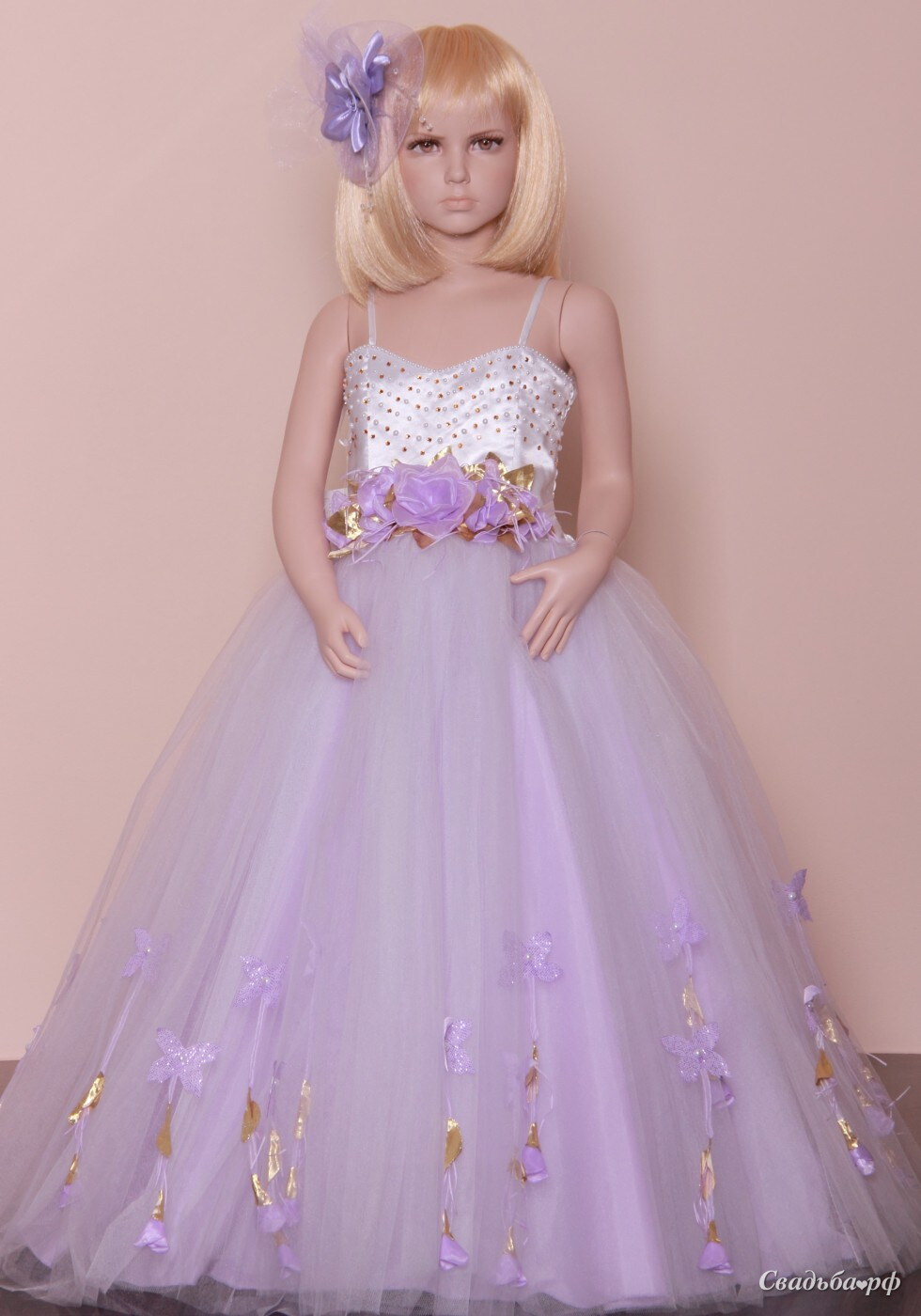 Пышное детское платье на лямках с завышенной талией. Лиф с V-образным вырезом расшит стразами и бусинами. Внизу лифа располагается композиция из цветов. Спинка присборенная на резинку и на талии завязывается на бант. Юбка контрастная, выполнена из мягкого фатина, где нижняя часть украшена сиреневыми цветами и золотыми листочками.