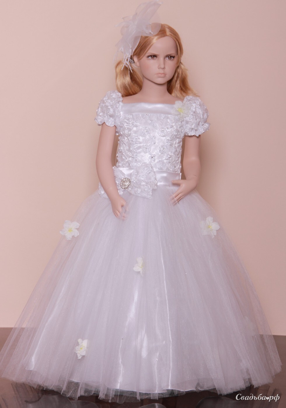 Пышное детское корсетное платье с приспущенными рукавами. Лиф украшен многочисленными цветами. На талии расположен пояс с бантом и брошью. Рукав-фонарик. Юбка фатиновая, украшена тканевыми цветами.