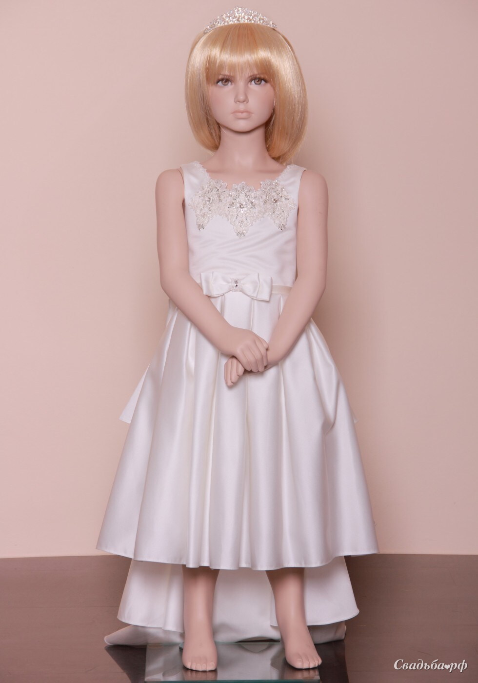 А-силуэтное детское платье на плечиках, выполненное из атласной ткани. Лиф платья классический, украшенный по горловине элементом кружева, расшитый бисером и стразами. Юбка по талии собрана в бантовые складки и украшена двойным прямоугольным бантом. Сзади по талии пристёгивается на кнопках ярусный шлейф с бантом и лентами.