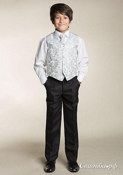 Набор (тройка) представляет собой: черные брюки, белая сорочка, жаккардовый серебристый жилет с пластроном.