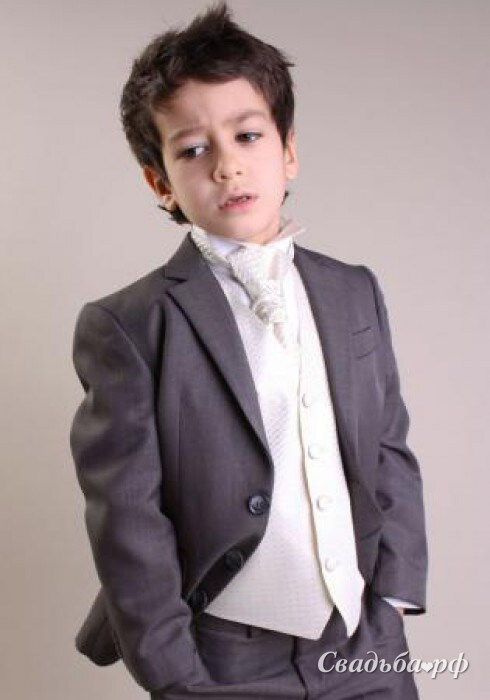 Классический серый костюм с нарядным жилетом и пластроном цвета (айвори), идеально подойдет как для официального мероприятия, так и для более торжественной церемонии, если украсить костюм жилетом с декоративным платочком.