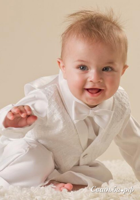 Детский нарядный костюмчик, специально подходящий для крещения, или для праздничного мероприятия после него. В комплекте представлено: нарядный комбинезон, украшенный жилетом с бабочкой и красивой шапочкой в тон к костюму.