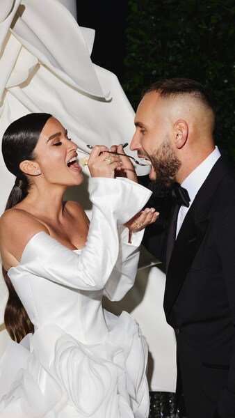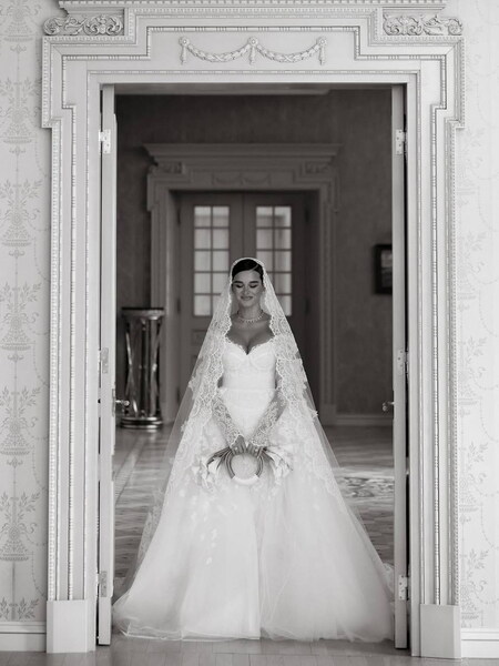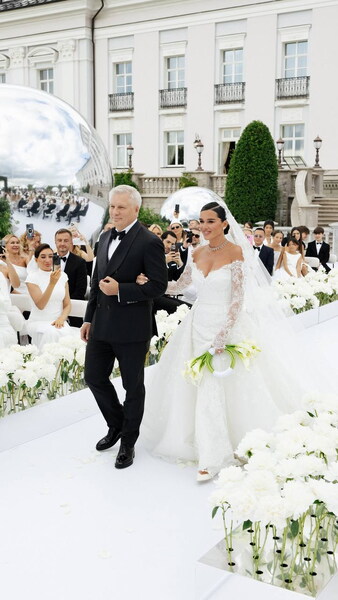 Как видим, на сей раз невеста выбрала роскошное кружевное свадебное платье-трансформер от ливанского свадебного бренда Zuhair Murad со съемной пышной юбкой с длинным шлейфом, а голову покрыла фатой, которая была еще длиннее шлейфа платья.