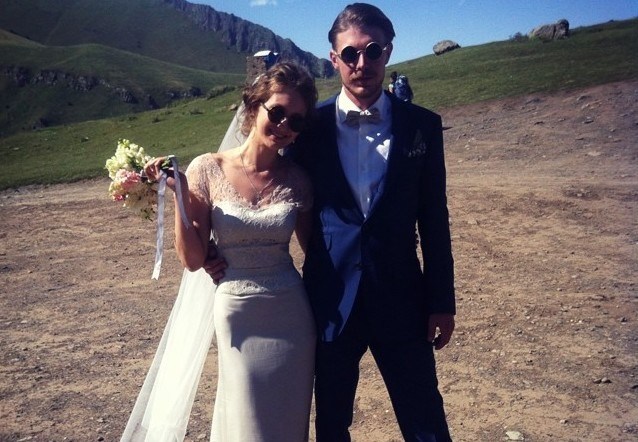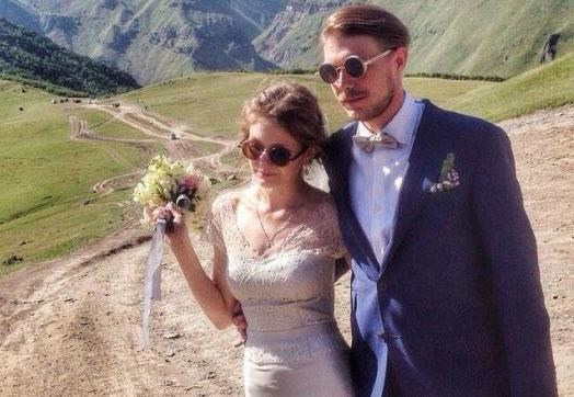 Для своей свадьбы невеста выбрала светло-кремовое платье прямого силуэта, с кружевным верхом, жених – синий костюм с галстуком-бабочкой. Некую хипстерскость молодоженам придавали круглые солнцезащитные очки.