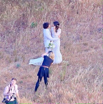 Как молодожены не старались уединиться от любопытных глаз, у них это не получилось. Самые находчивые папарацци ухитрились сделать несколько снимков свадебной церемонии с воздуха. На фотографиях (хоть они и не отличаются высоким качеством) видно как новоиспеченные супруги светятся от счастья. Также на снимках можно рассмотреть наряды молодоженов. Невеста выбрала элегантное свадебное платье рыбка с рукавами и длинным шлейфом. Жених был одет в классический белый костюм.