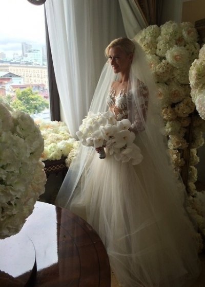 Невеста была неотразима в шикарном пышном свадебном платье с прозрачными рукавами от дизайнера Алены Ахмадуллиной. Не отставал от своей супруги и жених – элегантный приталенный костюм темно-синего цвета был Максиму к лицу.