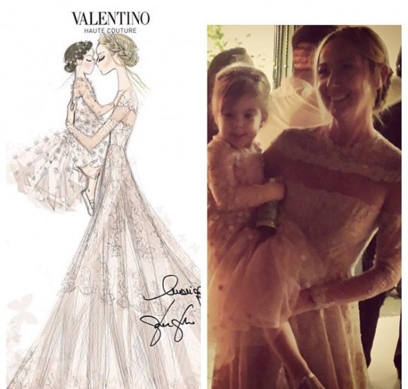 Для всей молодой семьи дизайнеры модного Дома разработали полноценный family look. Специально для маленькой дочери Фриды, Греты, модельеры Пьера Паоло Пиччоли и Марии Кьюри создали платье, которое идеально сочеталось с нарядом матери. А супругу Джаннини был предложен элегантный черный костюм.