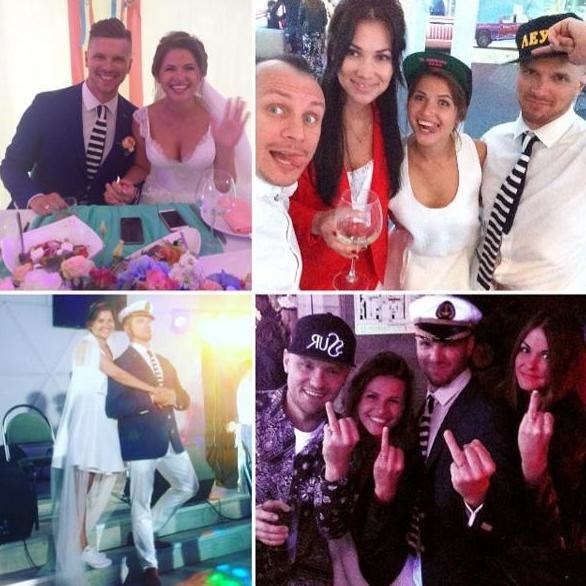 Уже позже, когда вся честная компания отправилась праздновать торжество в один из популярных ресторанов города, невеста вообще решила всех удивить. Она вышла в зал в легком коктейльном платье (к слову сказать, которое прекрасно гармонировало с «морским» костюмом жениха) и в белых кедах! Креативные ребята креативны во всем.