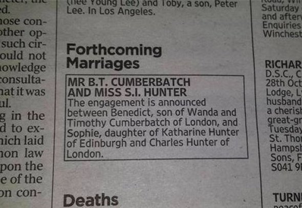 «Объявлена помолвка Б.Камбербэтча, сына Ванды и Тимоти Камбербетчей, лондонцев, и Софии, дочери Катарины Хантер из Эдинбурга и Чарльза Хантера из Лондона.»