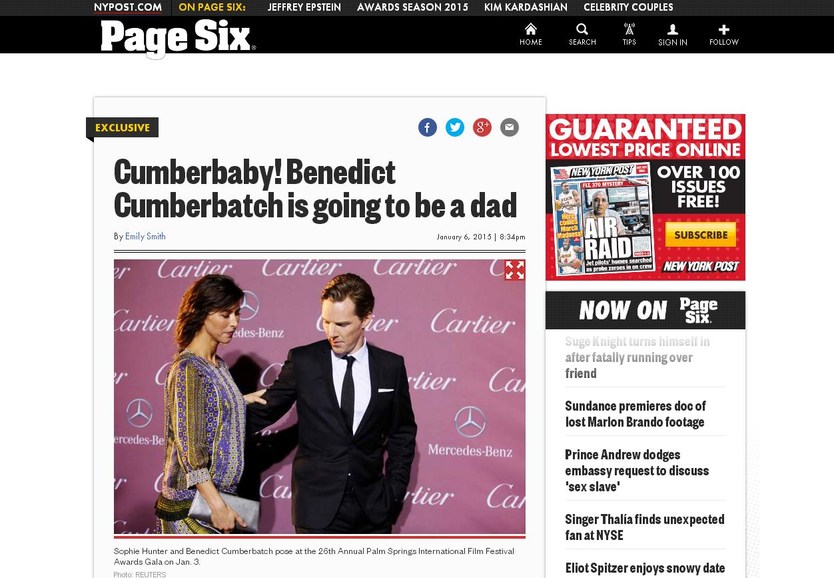 О том, что актер скоро станет отцом первыми узнали читатели интернет-издания PageSix (приложение к New York Post) в начале января 2015 года. Журналисты обыграли фамилию Cumberbatch.