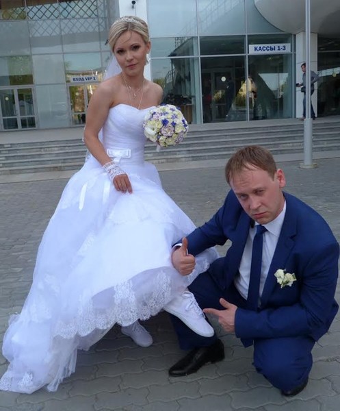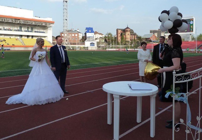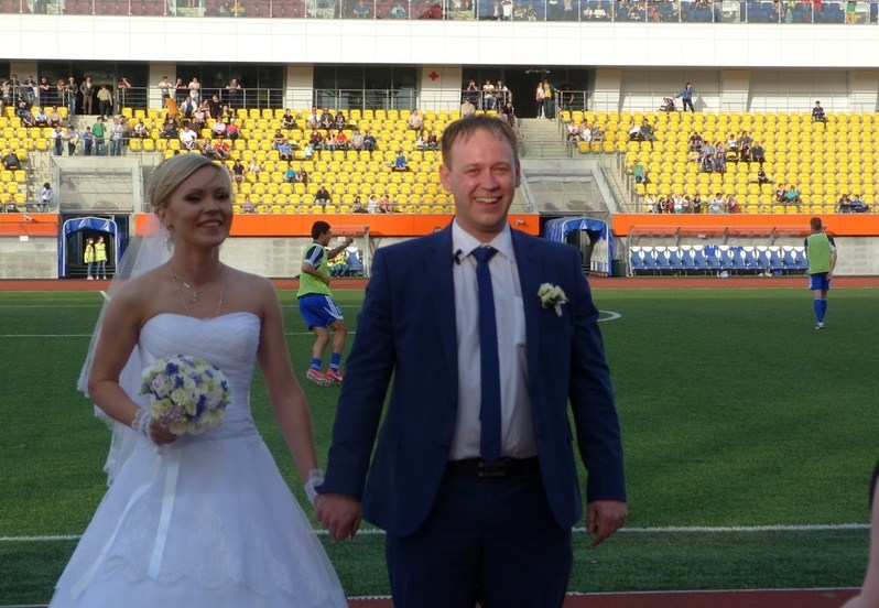 А вместо первого свадебного танца пробежали круг по стадиону, в связи с чем невесте пришлось отказаться от свадебных туфелек в пользу белых бутс.
