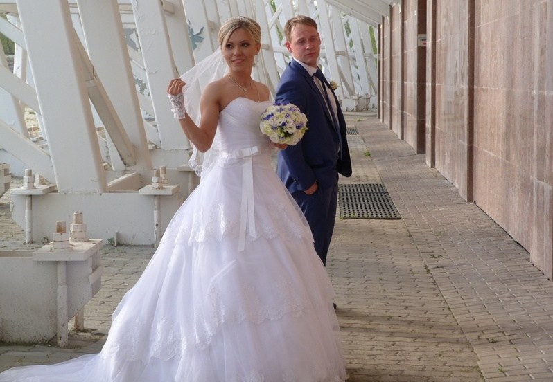 В остальном же свадебный дресс-код был соблюден: жених в костюме, невеста в белом платье, с фатой в прическе и свадебным букетом в руках.