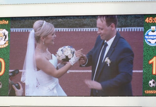 Во время перерыва между таймами на стадион вышли ведущий церемонии и жених с невестой. Под аплодисменты болельщиков они сказали друг другу «да» и обменялись кольцами.