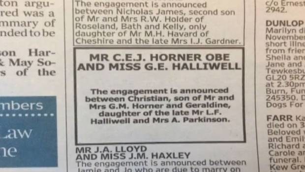Напомним, о помолвке Холлиуэлл с Кристианом Хорнером стало известно в ноябре прошлого года из объявления за 324 фунта в газете "Таймс" в колонке "Браки, рождения и похороны".
