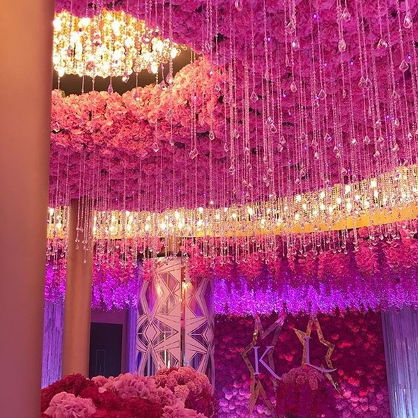 Зал, где проходил свадебный банкет, был украшен на высшем уровне. По всему периметру расставили композиции из живых цветов, повсюду горели свечи и свисали нити с переливающимися стеклянными бусинами.