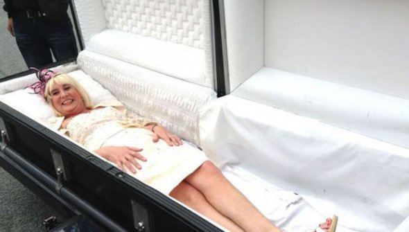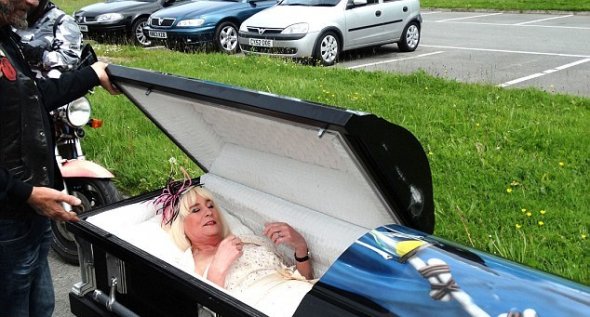 Не отставать от модного тренда решила и не очень молодая невеста из Британии. 58-летняя решила появиться перед многочисленными гостями, а главное, перед своим женихом, максимально эффектно. Поразмыслив немного, она остановила свой выбор на настоящем гробу классического черного цвета.