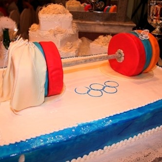 Свадебный торт-штанга на свадьбе тяжелоатлетов