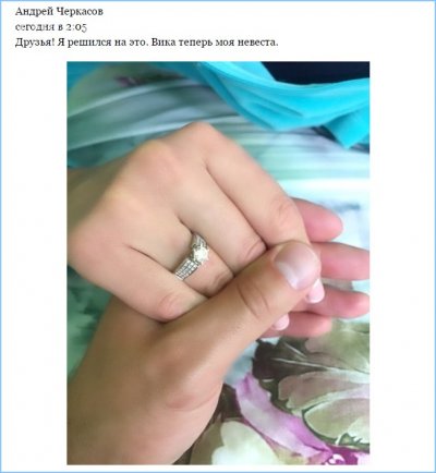 Девушка незамедлительно дала положительный ответ (пока ветреный парень не передумал). Ее даже не остановил тот факт, что помолвочное кольцо было слегка великовато. Вика тихо сходила в ювелирную мастерскую и подогнала дорогой сердцу подарок под нужный размер.