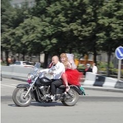 На этой мото-свадьбе Алексей и Анастасия креативили от души: вместо уже традиционного свадебного лимузина жених повез невесту в ЗАГС на мотоцикле в сопровождении кортежа из байкеров, невеста же отказалась от свадебного платья традиционного белого цвета, надев потрясающее красное. Но в кое-чем молодожены остались верны традициям: на невесте была белая фата, а в ЗАГСе они обменялись обручальными кольцами.