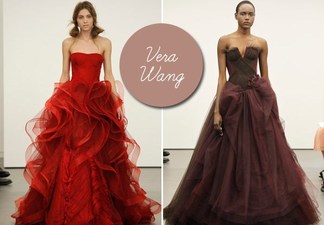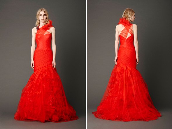 И если прошлая коллекция была готичного черного цвета, то в коллекции весна-лето 2013 Вера использовала палитру красных оттенков. Вероятно, сказалось происхождение дизайнера, ведь в Китае свадьба – это «красный» праздник и традиционным цветом свадебного наряда невесты считается именно красный – цвет благополучия и процветания. Но фасоны платьев новой коллекции далеки от китайских традиций – это облегающие платья в стиле «Русалочка», это многослойные юбки, создающие легкость и объем, столь характерные для платьев от Веры Вонг.