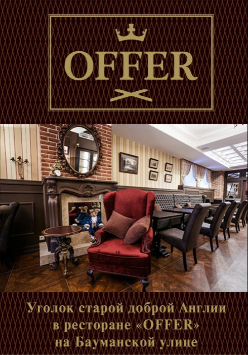 Уголок старой доброй Англии в ресторане ОFFER на Бауманской улице. Приятная, спокойная и уютная обстановка для проведения банкетов и вечеринок на 30-40 человек