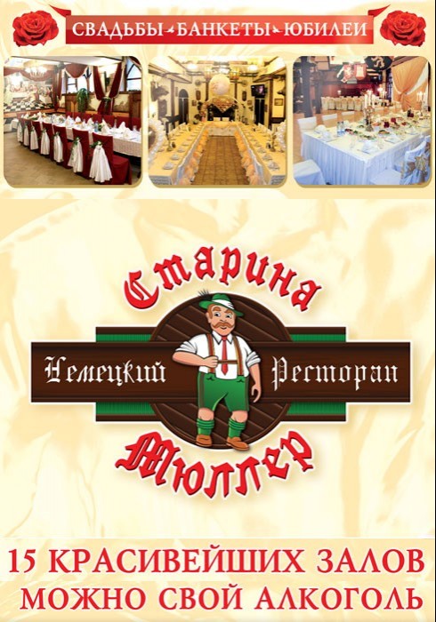 Ресторан «Старина Мюллер на Шмитовском» для проведения свадебного банкета предлагает на выбор 7 залов различной вместимости. Все залы порадуют своим необычным стилизованным оформлением, а профессиональные декораторы украсят под ваше торжество. Помимо превосходных банкетных блюд, на ваш праздник будет предоставлена вся необходимая аппаратура и организована развлекательная программа.