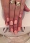 Романтичный свадебный маникюр выполнен на ноготках средней длины, заточенных в форме лопатки. Нежное персиковое покрытие дополнено белоснежным орнаментом и единичными стразами. Стоимость представленного свадебного маникюр + shellac составляет 1300 рублей. Если этот же дизайн при наращивании, то 1400 рублей.