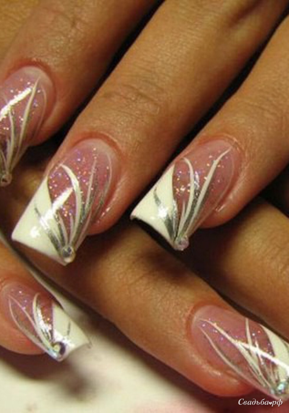 Классический белый френч со скошенной границей между прозрачным и светлым покрытием. Маникюр выполнен на нарощенных ногтях в форме лопаточки. Ногтевая пластина декорирована тончайшим орнаментом и стразами. Романтичный вариант для любого свадебного образа. Стоимость такой работы составляет 2100 рублей.