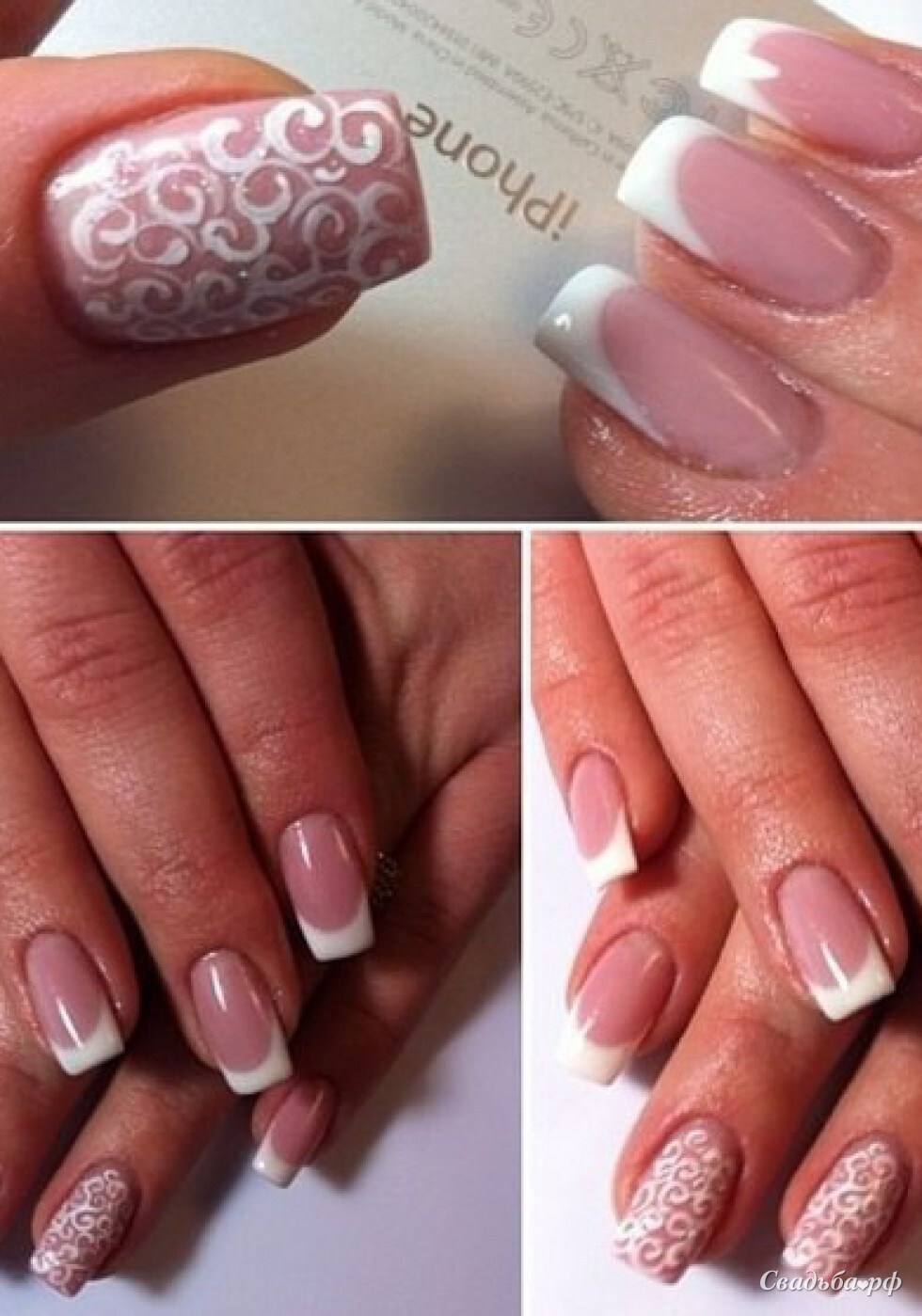 Белый свадебный френч и тончайшая роспись придадут Вашему образу нежность и естественность. Также выполнено наращивание ногтей средней длины. Форма лопатки сейчас особенно актуальна! Стоимость представленного френча составляет 1400 рублей. Дизайн (ажурная роспись) одного ногтя обойдётся Вам в 50 рублей.