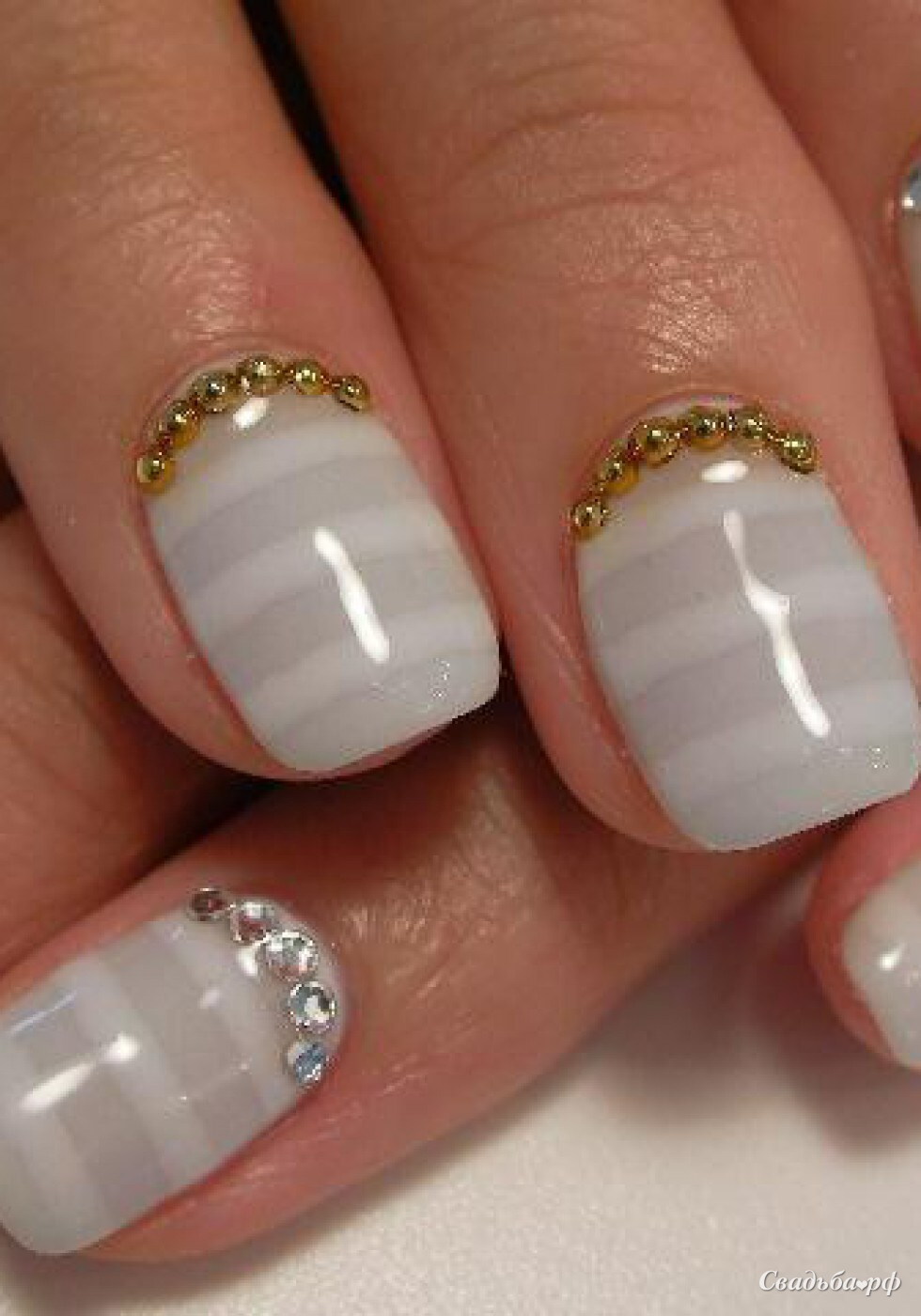 Нежный маникюр со светлым покрытием отличается оригинальным сочетанием оттенков: белые и молочные полосы придают ногтю необычную фактуру. На границе кутикулы и ногтя расположена вставка – аппликация из золотистых бусин или сверкающих стразин. Такой маникюр подчеркнёт красоту Ваших рук и невинность образа.