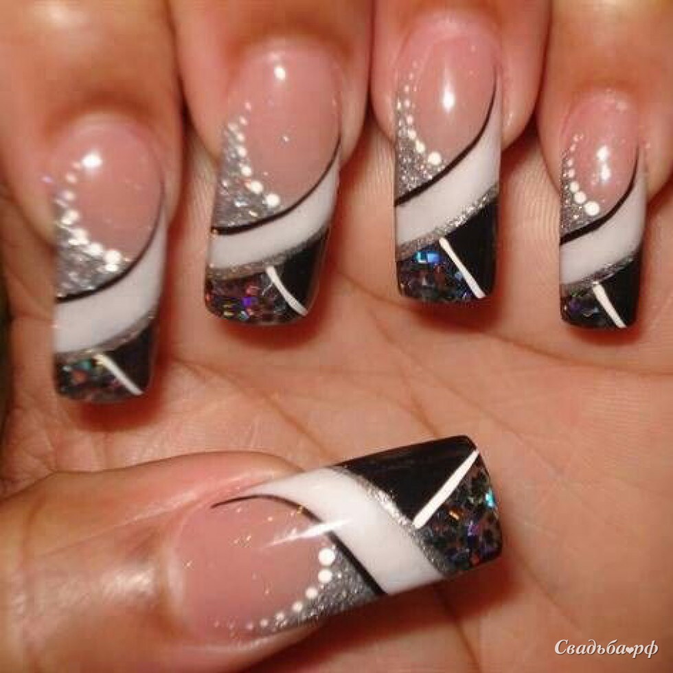Эффектный маникюр выполнен на нарощенных ногтях внушительной длины. Прозрачное покрытие эффектно сочетается с чёрным, серым и белым лаком. Ногтевая пластина также дополнена стразами. Ноготки с такими контрастными элементами будут приковывать к себе всё внимание окружающих. Также маникюр отлично получится на фотографиях.