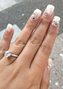 Французский маникюр выполнен на длинных ногтях, подпиленных под лопатку. Белые кончики гармонично сочетаются с прозрачным покрытием и блёстками. Каждый ноготок декорирован крупными стразами и бусинами. Такой маникюр акцентирует внимание на обручальном кольце и придаёт рукам ухоженный вид. Стильное дополнение Вашего образа.
