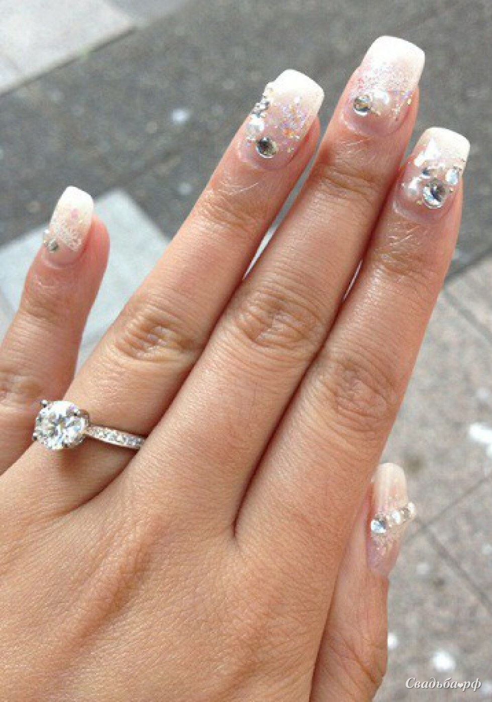 Французский маникюр выполнен на длинных ногтях, подпиленных под лопатку. Белые кончики гармонично сочетаются с прозрачным покрытием и блёстками. Каждый ноготок декорирован крупными стразами и бусинами. Такой маникюр акцентирует внимание на обручальном кольце и придаёт рукам ухоженный вид. Стильное дополнение Вашего образа.