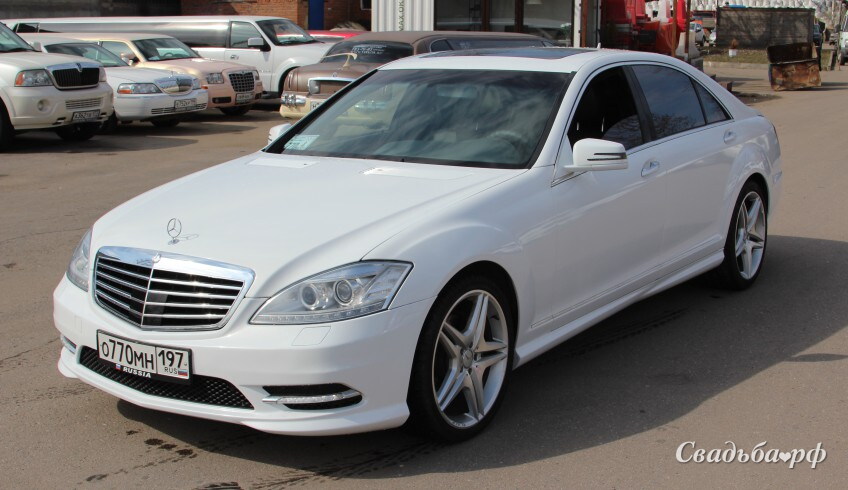 Mercedes Benz W221 цвета серебристый металлик. Эта модель позволит Вам организовать роскошную свадьбу.Кожаный салон отделанный натуральным деревом, DVD и аудио системы. Кондиционер. натуральным деревом, большое пространство для ног за счет удлиненного салона, на заднем окне установлена автоматическая шторка.