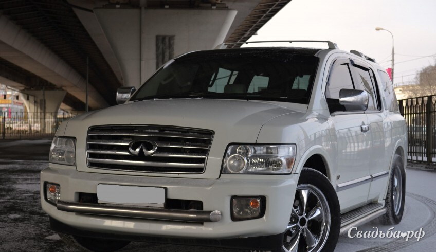 Белоснежный автомобиль премиум класса Infiniti QX-56 не оставит равнодушными даже самых требовательных ценителей дорогих и надёжных машин. Этот красавец с тонированными стеклами и ослепительными вставками на кузове рассчитан на 6 пассажиров. Просторный салон отделан комбинированной кожей и дополнен новейшей системой климат-контроля.