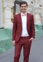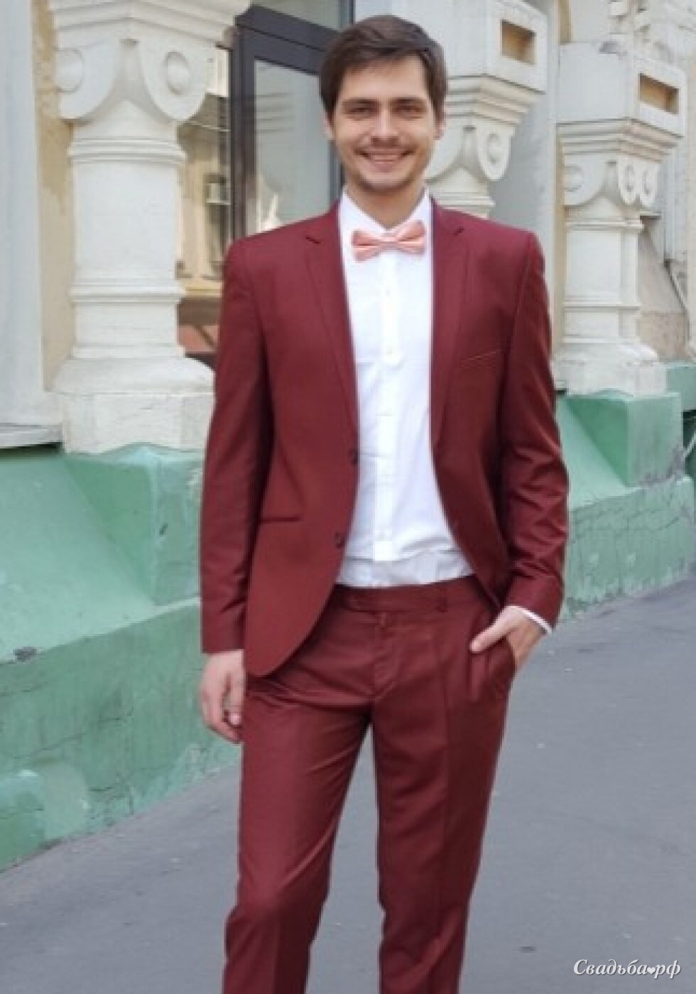 Костюм цвета марсала, приталенный с узкими брюками.
